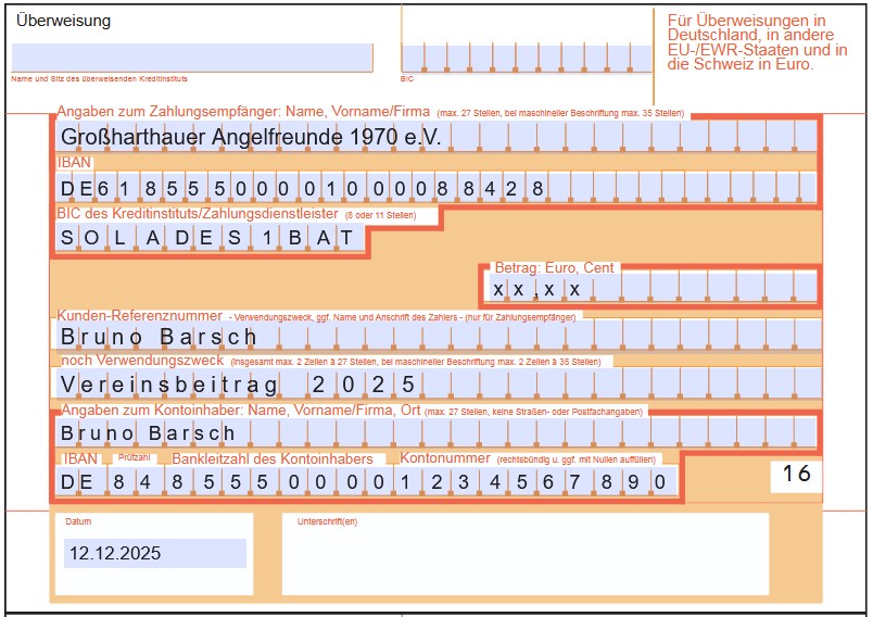 Zahlungsempfänger: Großharthauer Angelfreunde 1970 e.V. IBAN: DE61 8555 0000 1000 0884 28 BIC: SOLADES1BAT Verwendungszweck: Name, Vorname, Vereinsbeitrag 20xx (siehe Musterüberweisung) - Zu den zwei festgelegten Terminen zur Markenausgabe, welche in der Regel Ende Dezember und Anfang Januar stattfinden, wird der Schatzmeister bei Nachweis der richtigen Überweisung die Beitragsmarken aushändigen.